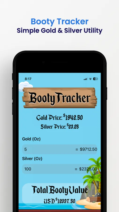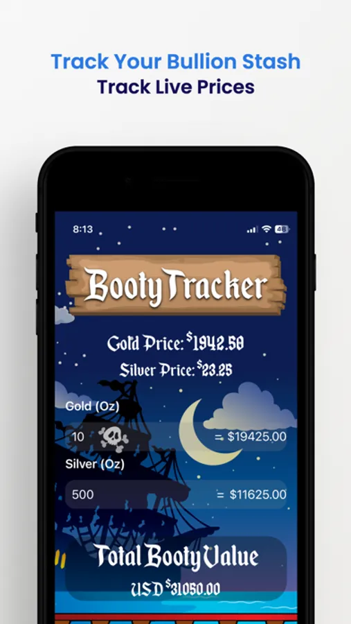 Keep a keen eye on the market with live gold and silver prices right at your fingertips. Whether you're a seasoned investor or a curious landlubber, Booty Tracker allows you to stay updated on precious metals' ever-changing values. But that's not all, me hearties! This app goes beyond mere observation; it lets you calculate the total value of your treasure trove by inputting how much gold and silver you possess. Watch as the value of your bullion chests increases with every rise in prices!