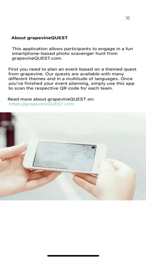 First you need to plan an event based on a themed quest from grapevine. Our quests are available with many different themes and in a multitude of languages. Once you've finished your event planning, simply use this app to scan the respective QR code for each team.
