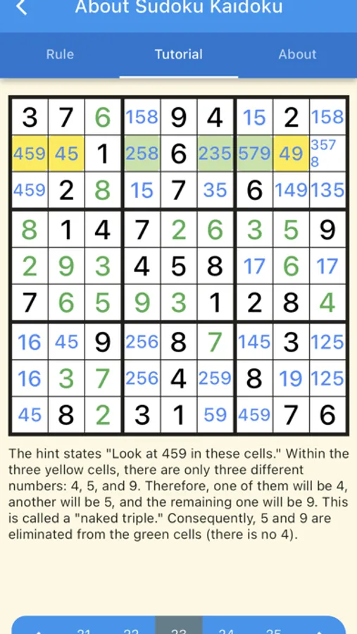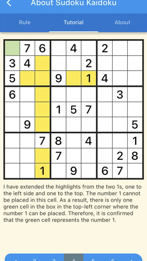 It is a Sudoku app. When you select a difficulty level, it randomly presents a problem from a wide range of puzzles. Pressing the hint button will provide you with hints on how to solve it. The hints for the puzzles cover not only basic solving techniques but also various advanced strategies such as Naked Pairs and X-Wing, which are explained in the accompanying tutorial book.