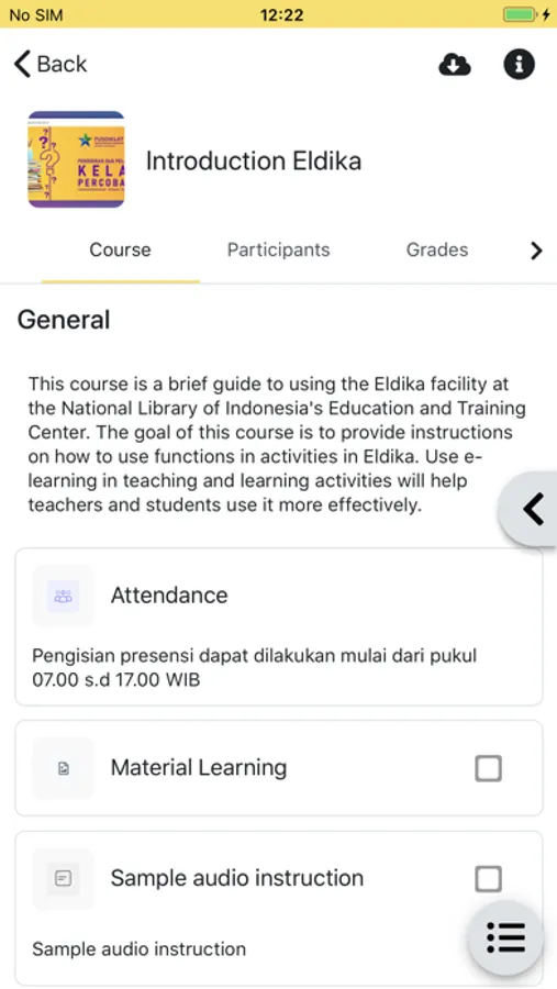 ELDIKA is E-Learning for Library Training owned by National Library of Republic of Indonesia. This application serves as a virtual classroom for participants of library training. ELDIKA is specifically designed for participants of library training. Log in with your KANTAKA account, then you can engage in training activities on this application. On this application, participants can: