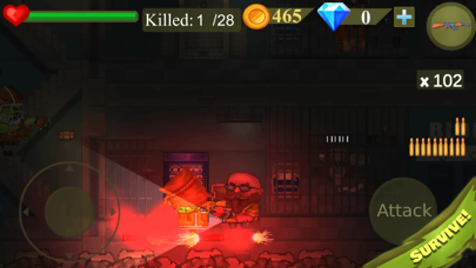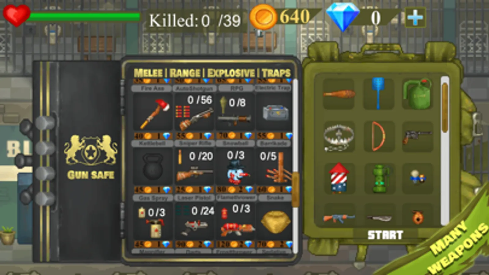 Take the weapon from the gun safe and fight for survival vs zombies and mummies! You’ll earn gold coins for killing zombies and completing quests .You can buy melee or ranged weapons, explosives or traps.