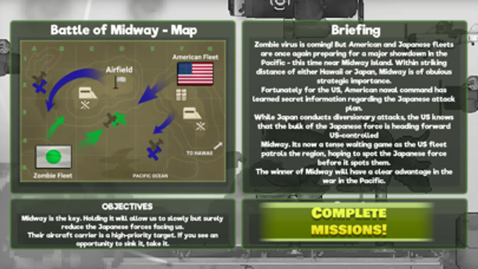 - Destroy zombie planes, ground targets, tanks, anti-aircraft installations, machine guns, mortars, artillery, bunkers, communications systems, airfields, aircraft carriers and submarines.