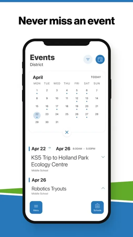The event section shows a list of events throughout the district. Users can add an event to their calendar to share the event with friends and family with one tap.