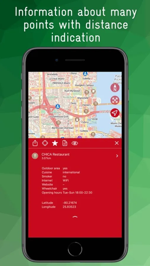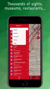 For many POIs there is further information such as opening hours, address, disabled access, ... Notes or favourites can be created for each POI, a history list shows the most recently used POIs, content can be shared.