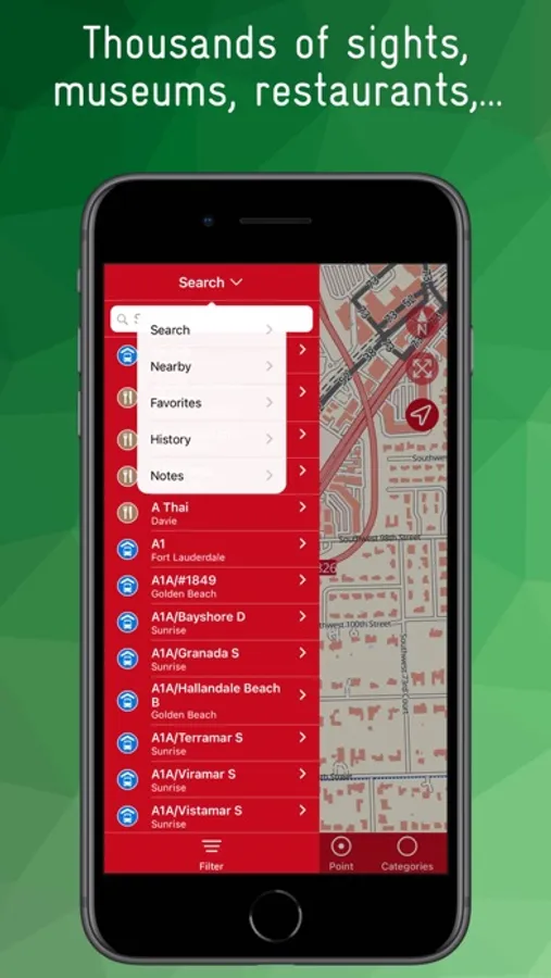 An integrated database allows you to search for POIs as well as a large number of streets, towns, villages, districts, etc. The search can be filtered by category and/or distance.