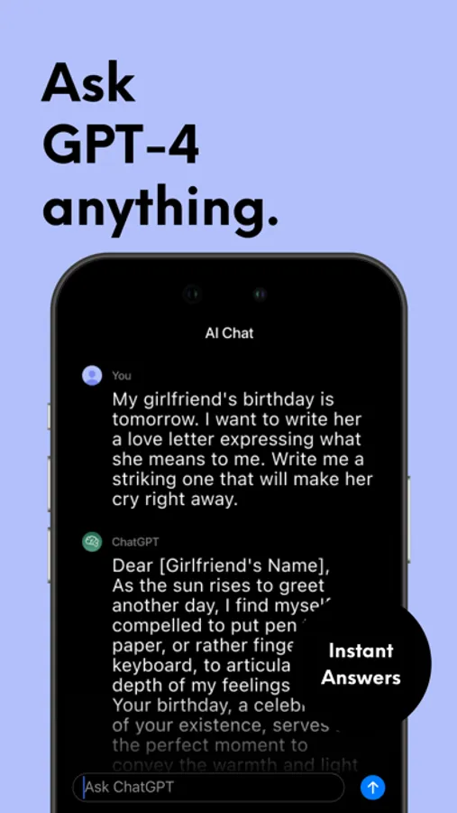 AI Chat is not just a chatbot; it’s an infinite universe within your pocket! A true intellect engineered with the mind-blowing power of GPT-4, AI Chat is the culmination of human ingenuity and AI advancement.
