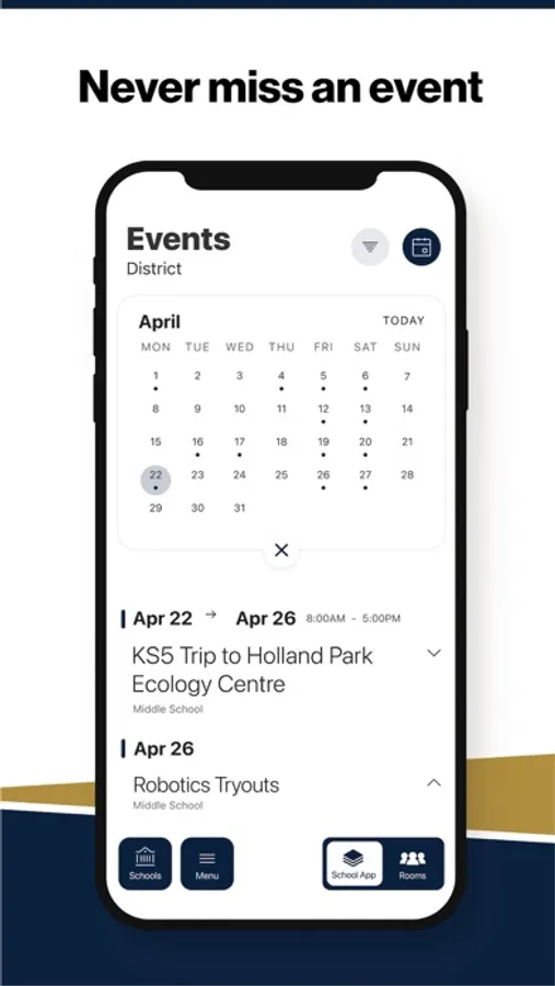 The event section shows a list of events throughout the district. Users can add an event to their calendar to share the event with friends and family with one tap.