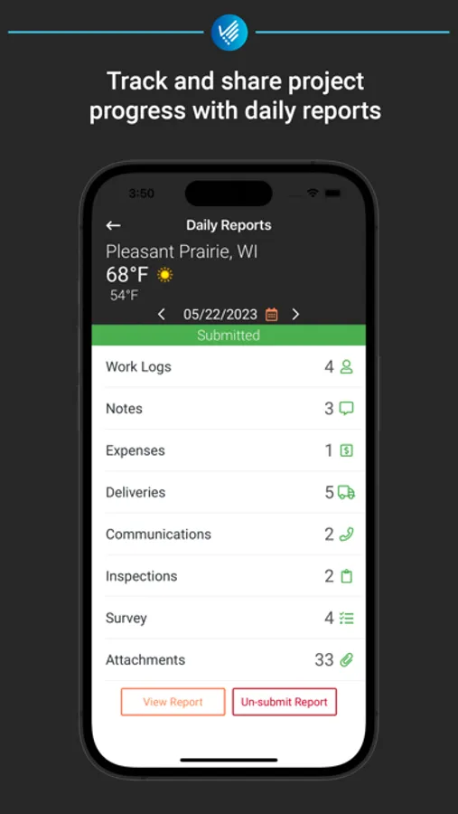 Use daily reports to log inspections, site observations, deliveries, site photos, and more. Automatically send daily and weekly reports to team members and clients to keep them updated on job progress.