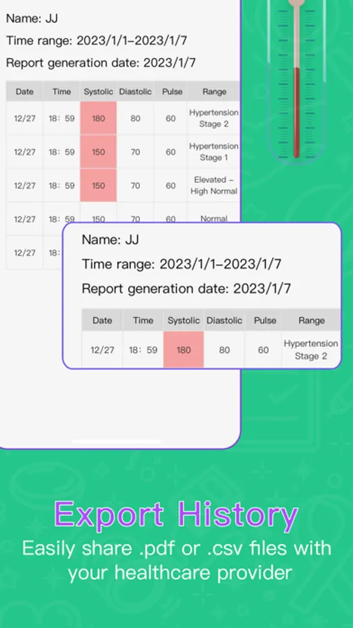 #Compile your blood pressure data into sheets, and easily share .pdf or .csv files with your healthcare provider.