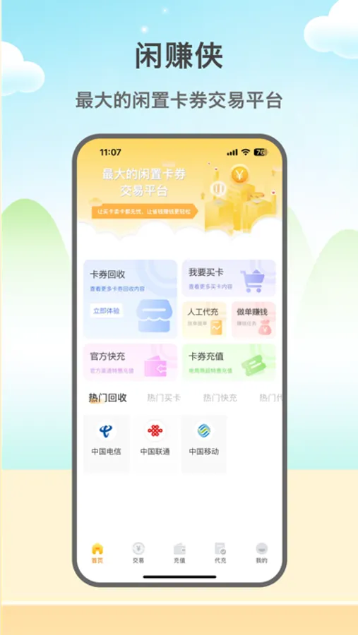 闲赚侠竭诚为个人及企业提供一站式的卡券交易和虚拟充值等服务,帮您实现快速将闲置卡券资源价值最大化,以及可以用低价格实现快充省钱等等,让您买卡和卖卡都无忧。