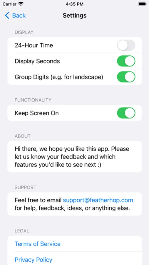 Once you tap on the screen you can also access Settings, where you can toggle 24/12 hour mode, displaying seconds, grouping of the digits (grouped is more practical, but in landscape ungrouped looks more interesting), and keeping the screen on.