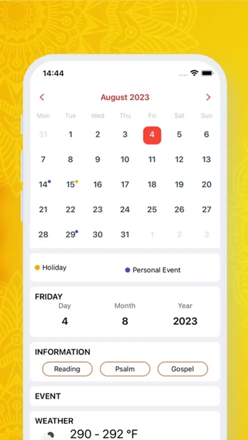 The Catholic Calendar 2023, also known as the Laity Calendar, The Catholic Calendar 2023 application has full information about the liturgical calendar, information on special holidays, solemnities, adoration schedule, daily word of God information, and accompanying meditation.