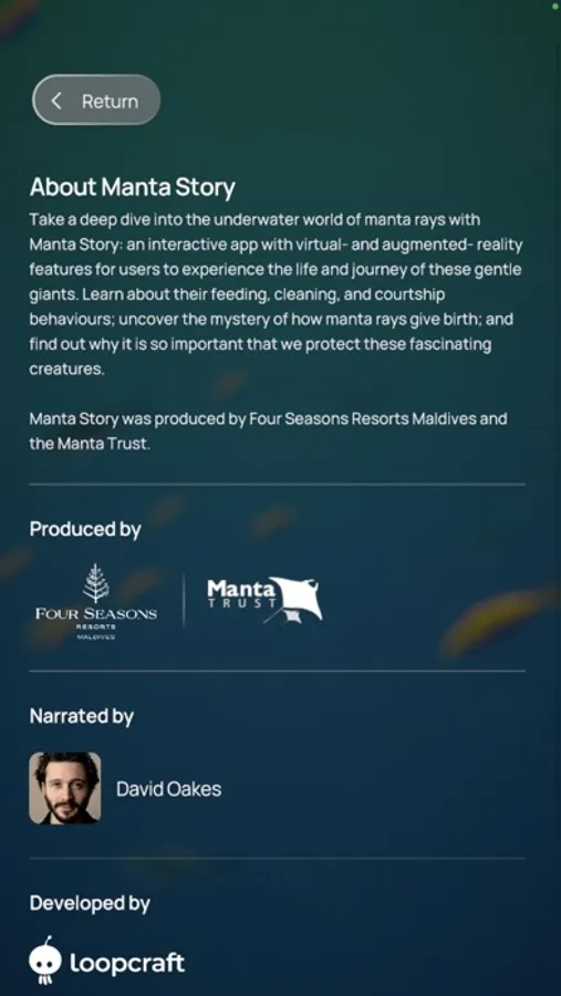 Take a deep dive into the underwater world of manta rays with Manta Story: an interactive app with virtual- and augmented- reality features for users to experience the life and journey of these gentle giants. Learn about their feeding, cleaning, and courtship behaviours; uncover the mystery of how manta rays give birth; and find out why it is so important that we protect these fascinating creatures.