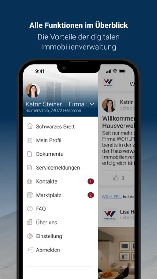 - Direkt: Mit der WOHLFEIL App erhalten Sie alle wichtigen aktuellen Informationen zu Ihrer Liegenschaft direkt am schwarzen Brett und können diese kommentieren.