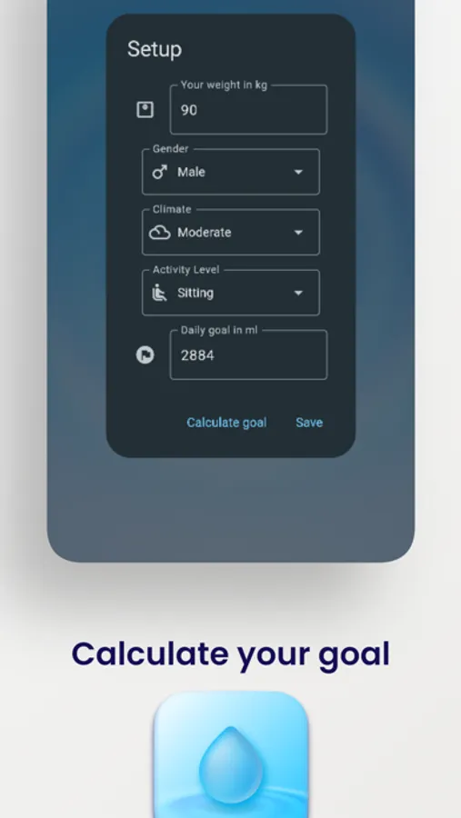- Personalized Hydration Goals: Set daily hydration targets based on your gender, weight, activity level, and climate for a truly personalized experience.