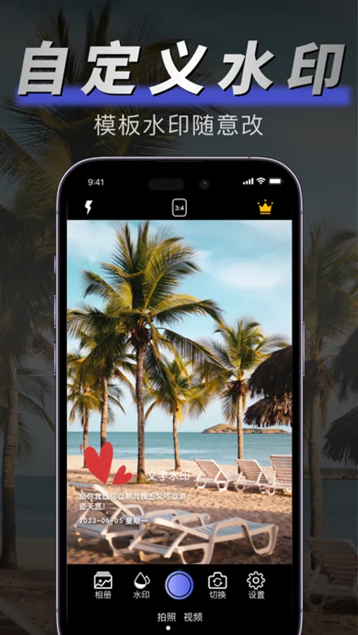 * 自定义水印内容:可自由开关和编辑水印内容选项,设置自己的纪念日、编辑心情文字等