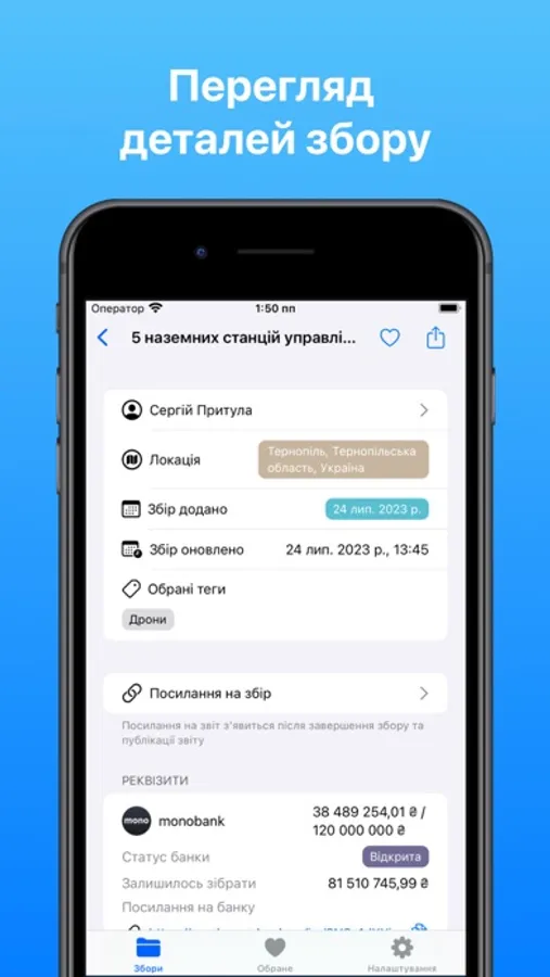 - Деталі та відстеження прогресу: переглядайте деталі збору, відповідальну особу, прогрес збору коштів для кожного збору
