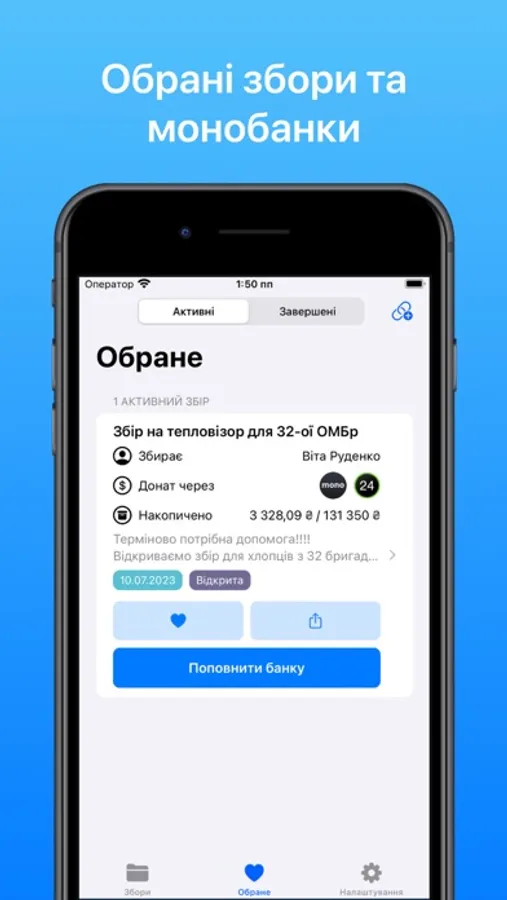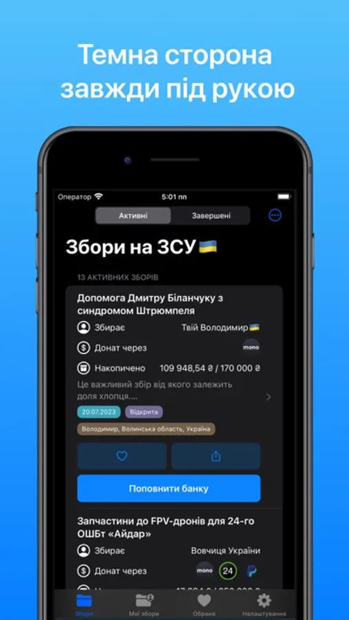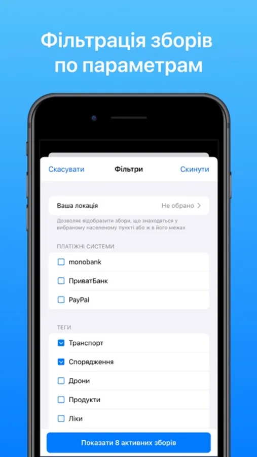 - Фільтрація зборів: можна вибрати збори по містам, тегам або платіжним системам. Шукайте збори поряд з вашим населеним пунктом