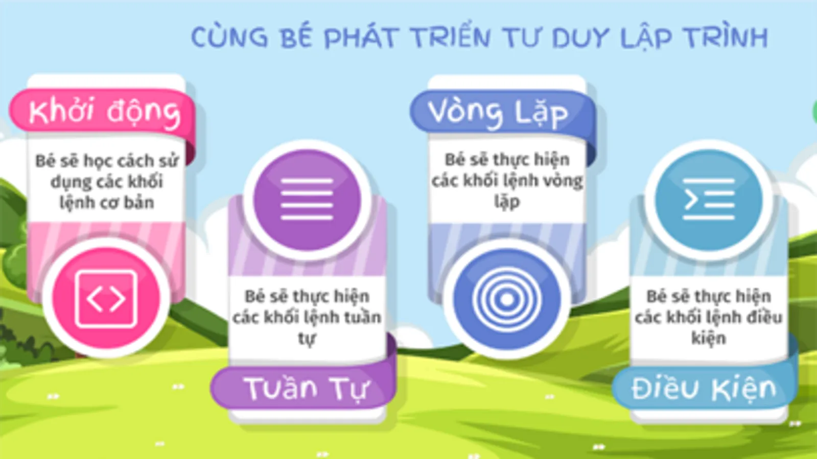 • Vòng lặp: Thay vì phải ghép nhiều khối lệnh giống nhau thì bé sẽ dùng vòng lặp để thể hiện việc lặp lại nhiều lần một tập hợp lệnh