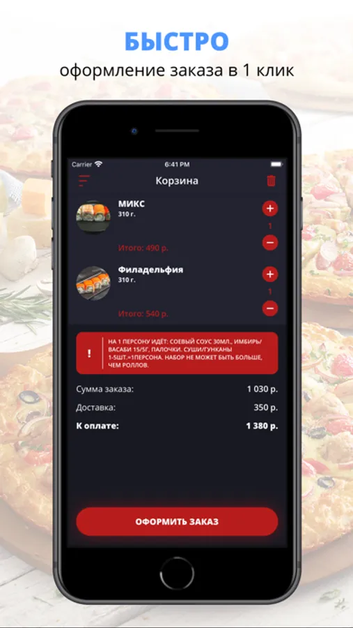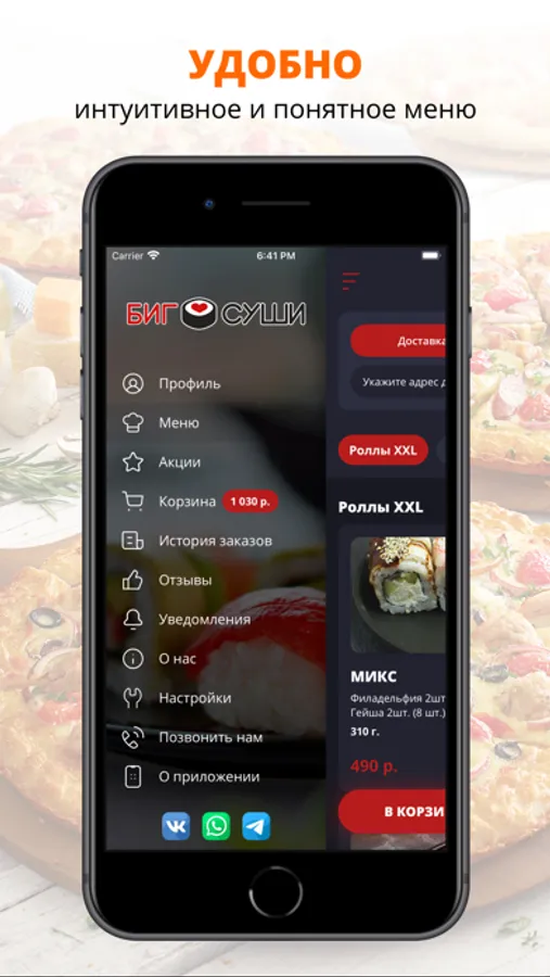Скачивайте наше приложение, оформляйте заказ и наслаждайтесь любимой едой, где бы Вы ни были! Приятного аппетита!