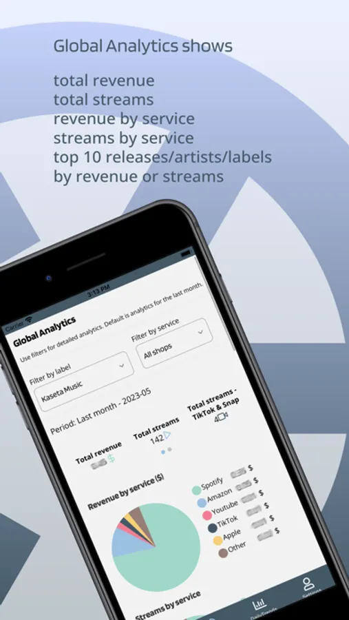 -Global Analytics (total revenue and total streams) for their releases on streaming platforms (Spotify, Deezer, Apple, Tik Tok, etc.) for the period of last month(by default).