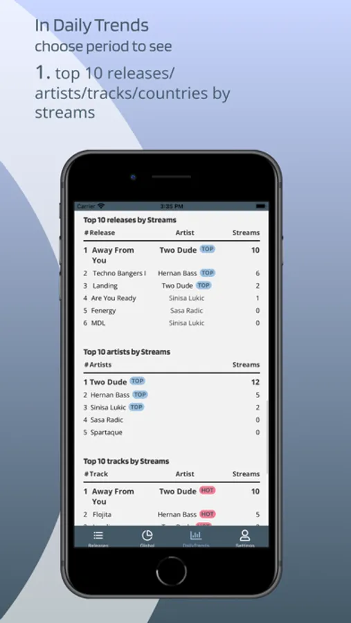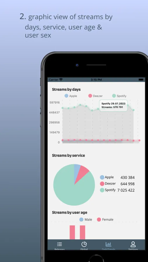 -Daily Trends (total streams, total saves, streams by service, streams by age, etc. ) for their releases on streaming platforms (Spotify, Deezer, Apple, Tik Tok, etc.) where they can choose period of most recent date, last 7 or last 14 days, this month and last month for the analytics.