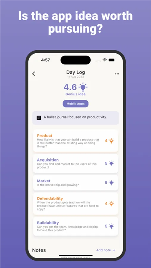 Overcome idea paralysis and confidently select your next venture by leveraging data-driven insights and the app's scoring system.