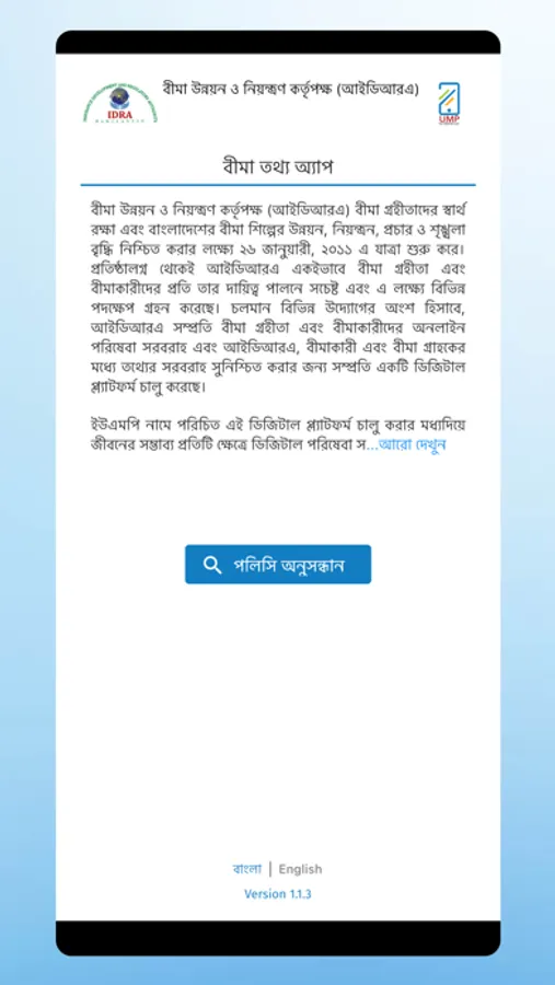 Insurance Development and Regulatory Authority (IDRA) started its journey on January 26, 2011 with a mandate to protect the interests of policyholders, and to regulate, promote and ensure orderly growth of the insurance industry of Bangladesh Over the years IDRA has taken various measures to uphold its responsibility towards policyholders and insurers alike. As part of its ongoing initiatives, IDRA has recently introduced a digital platform to provide policyholders and insurers a multitude of online services, and to bridge any information gap that might exist between IDRA, insurers and policyholders. This digital platform is known as Unified Messaging Platform(UMP).This is not only just a messaging platform but also a building block towards realizing our national goal of providing digital services (Policy-Repository, e-Receipt, e-KYC, e-Agent Approval, BI Tools, actuarial valuation, SMS, Email, Policyholder Web Portal, Policyholder Mobile App etc) for every possible aspect of life. “UMP Policyholder Mobile App” aims at providing vital information and services for policyholders. IDRA is gradually converting crucial information for each policy into a digital format known as e-policy which will be centrally stored by IDRA. An e-policy will contain information such as the policyholder profile, policy terms, premium payment history, policy status etc. A policyholder can view up-to-date information about his/her policy through the “UMP Policyholder Mobile App”.This Platform is expected to help alleviate any information gap that might arise between a policyholder and the policy provider, the insurance company. This direct communication between policyholders and IDRA is touted to increase trust and loyalty between an insurer and its customers.