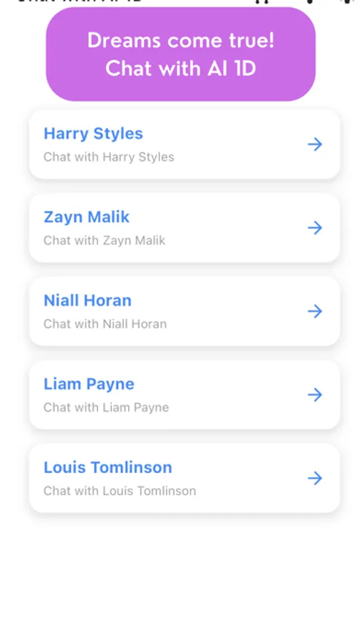 - AI-Driven Conversations: Our advanced AI technology simulates realistic and interactive chats with each One Direction member, making you feel like you are really talking to them.