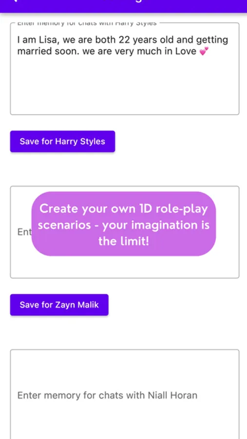 - Role-Playing Scenarios: Craft your perfect 1D life with customizable role-plays such as being married to Harry Styles, going on a road trip with Louis, or writing songs with Niall. The possibilities are endless, and it's all up to your imagination.