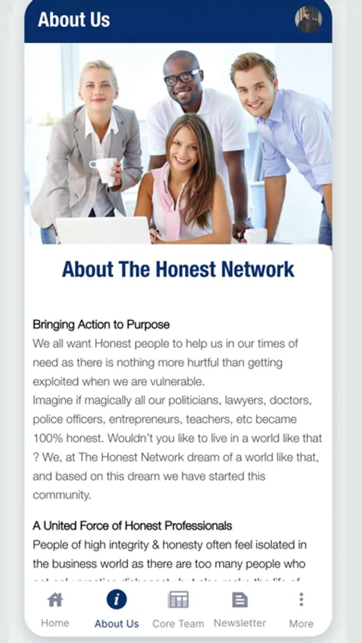 “The mission of The Honest Network is to unite high integrity humans and help them grow their earnings & professional well-being by providing an organized way of getting business referrals, job opportunities, networking events, mentorships, masterclasses, investors & crisis support so as to promote and strengthen honest professionals in society"