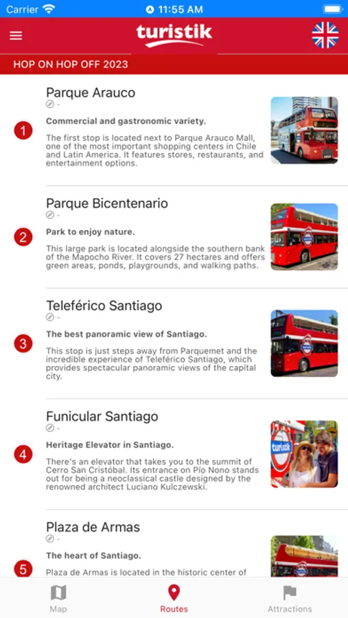 Here you can find out the route of the Hop On-Hop Off bus and its location in real time, as well as different attractions that you can visit near the stops.