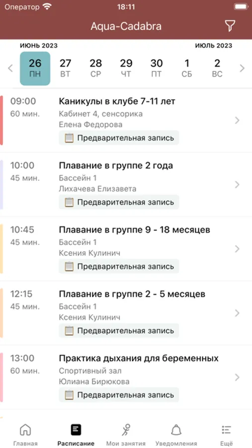 Онлайн запись на занятия, отмена занятий, покупка абонементов.