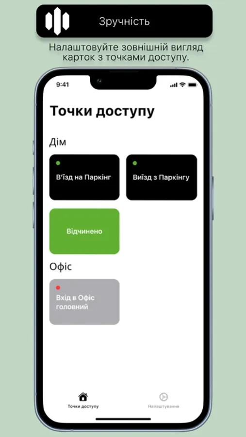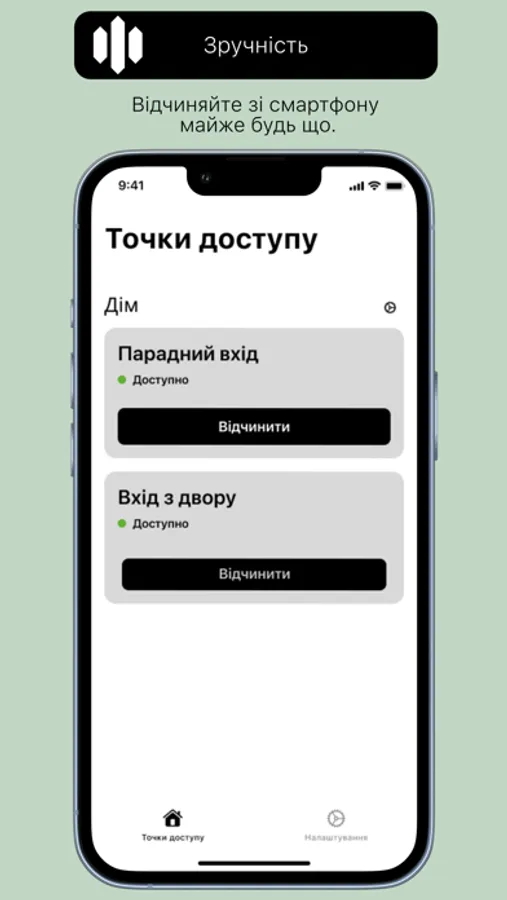- Відчиняйте будь-які точки доступу зі смартфона - ворота, двері, шлагбауми, тощо;