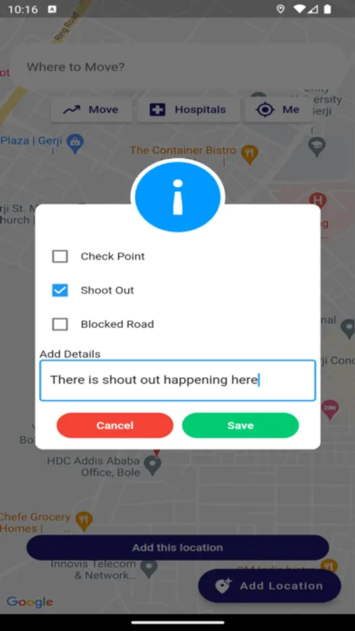 This app is developed by team of proffessional Sudanese diaspora in response to the ongoing war in Sudan. The main purpose of the app is to provide safe routes for our people in Sudan and this goal is approached by crowd sourcing the danger points all over the country so that whenever you have seen any thing that you think it's risking someone's life just upload it in the app by providing enought description and notes about a specific point, and when the other user wants to go from A to B he will get all points around his route and he can click and know what is exactly going on there so that he could avoid the specific point.
