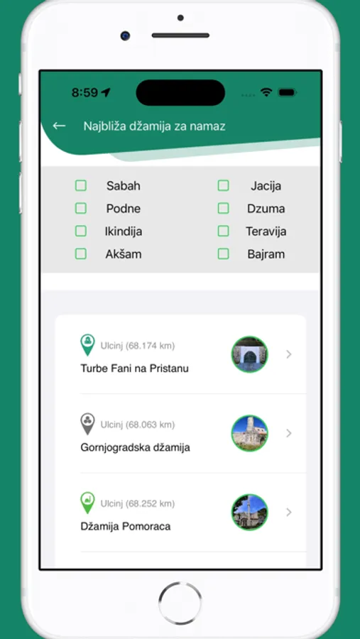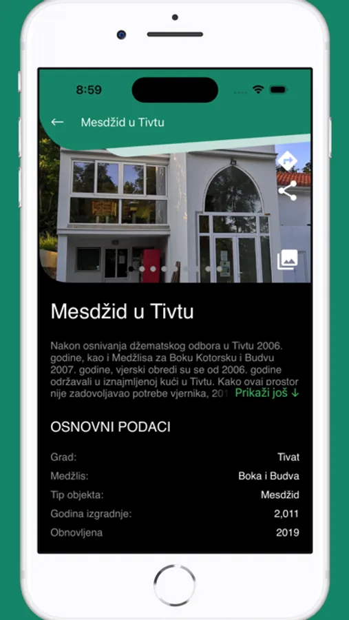 iOS aplikacija „Islamski objekti u Crnoj Gori“ predstavlja jedinstveni digitalni katalog za preko 190 objekata - svih džamija, mesdžida, turbeta i nekoliko istorijskih lokaliteta Islamske zajednice u Crnoj Gori. Korisniku su dostupni istorijski i osnovni podaci sa fotografijama o svakom objektu, geografski podaci sa mogućnošću navođenja do željenog objekta, kao i podaci o vjerskim aktivnostima u odabranom objektu. U svrhu ažuriranja podataka i eventualnih ispravki, korisnicima je ponuđena opcija „prijavite pogrešan podatak“, putem koje upućuju autoru željene sugestije. Aplikacija nudi mogućnost filtriranja objekata prema tipu objekta, medžlisu, gradu i periodu izgradnje. Početna stranica aplikacije prikazuje mapu sa lokacijama objekata uz opciju sadržajnog prikaza objekata po nazivima, sortiranim po udaljenosti od lokacije korisnika. Mapa ima opciju i satelitskog prikaza. Takođe, integrisana je opcija „najbliža džamija za namaz“, koja omogućava korisniku da izborom željenog namaza dobije redosled po udaljenosti svih džamija u kojima se obavlja odabrani namaz. Aplikacija ima i dodatne servise za vjernike, odnosno vaktiju sa vremenima namaza, smjer Kible, hidžretski kalendar sa islamskim važnim datumima i konverterom, kao i korisne linkove.