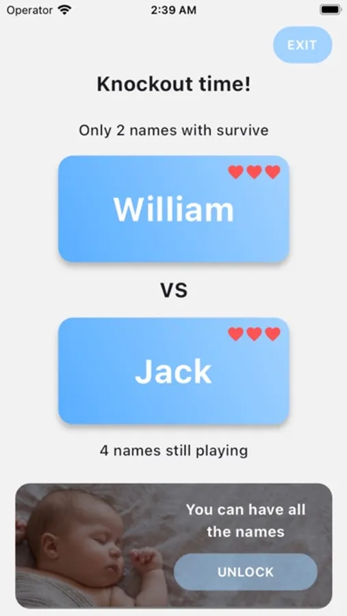 But that's not all! Baby Names Picker takes the naming game to a whole new level with the thrilling Knockout phase. Each remaining name is assigned three lives, and clashes ensue as pairs of names go head-to-head. Will your favorite name emerge victorious or fall by the wayside? The suspense and anticipation build as names battle it out until only the strongest contender remains standing.