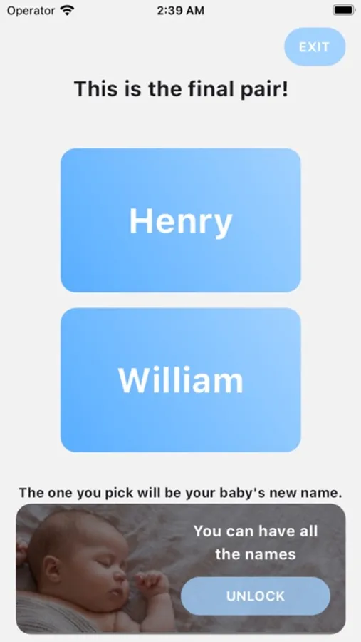 Don't leave this crucial decision to chance. Download Baby Names Picker from the App Store today and embark on an exciting journey of name exploration. Simplify the process, have fun, and make the perfect choice for your newborn. Let Baby Names Showdown be your trusted guide in welcoming your little bundle of joy with a name that will accompany them throughout their extraordinary life.