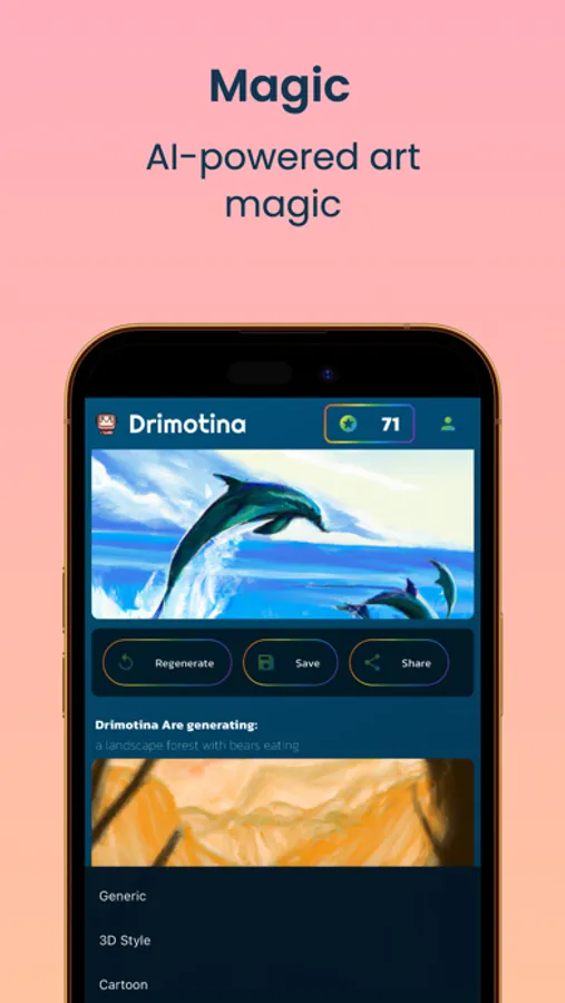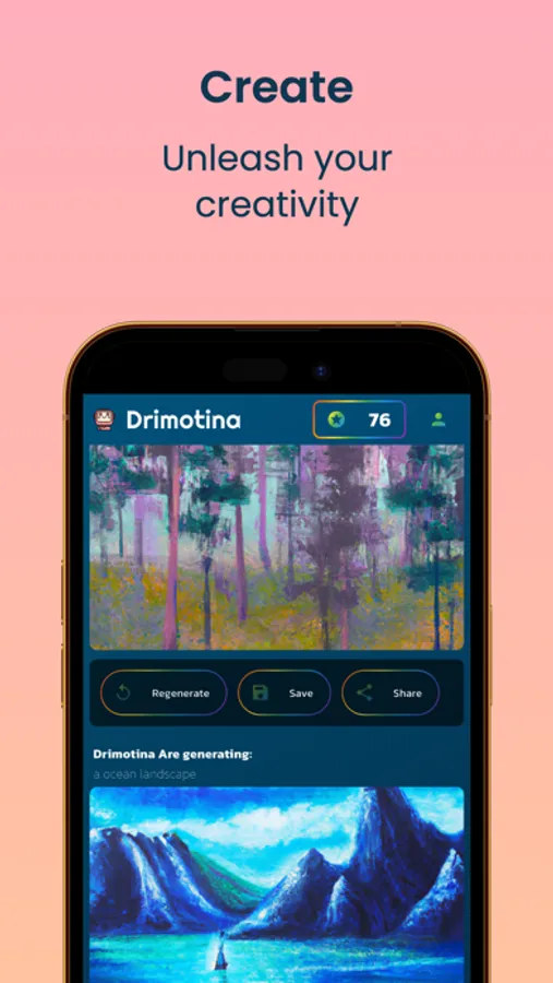 Whether you're seeking inspiration, looking to explore different art styles, or simply enjoy the process of creating mesmerizing art, Drimotina is the perfect companion for your mobile phone. Tap into the limitless possibilities of AI-generated art, experience the joy of artistic expression, and elevate your creativity with Drimotina – the ultimate AI Art Generator for your pocket.