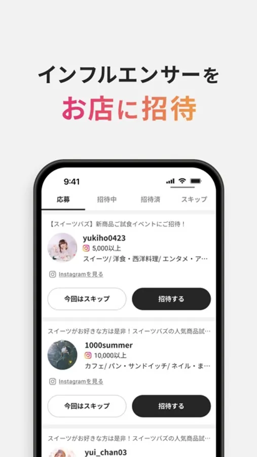 取材先を探しているインフルエンサーを自社施設・店舗に招待し、取材を通じて施設の魅力を拡散してもらうことで、SNS経由での集客拡大を実現します。