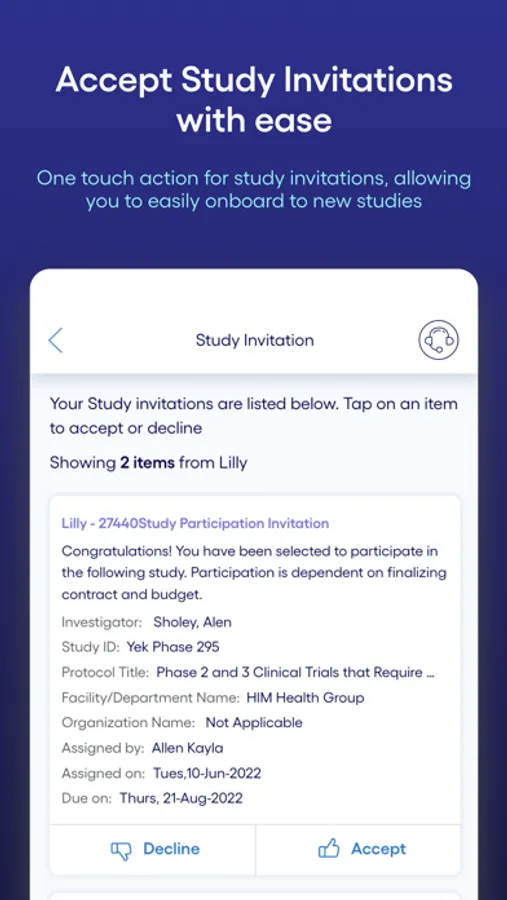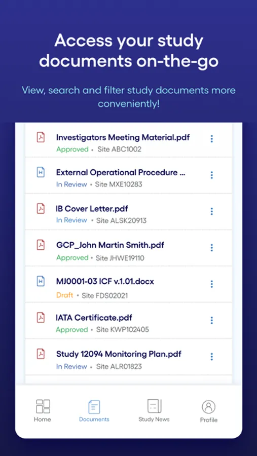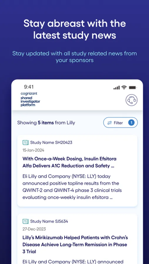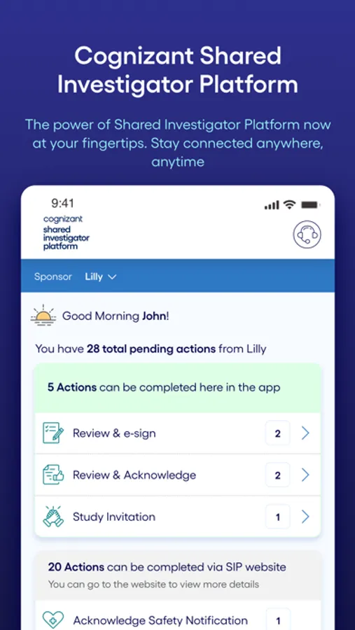 The Shared Investigator Platform (Cognizant SIP) Mobile App features a user friendly interface to navigate and manage your actions on the Shared Investigator Platform. With this app, site users can easily login and E-sign using their existing SIP credentials and enable biometric authentication to simplify the subsequent login and E-signature processes. This app offers an easy review of the pending actions, accept study invitations, View and generate FDA Form1572, view the study news, acknowledge safety notifications, view study documents, complete Document Exchange tasks published by your sponsor organizations and receive push notifications of latest study news published and assigned tasks.