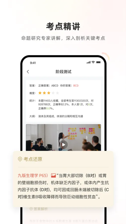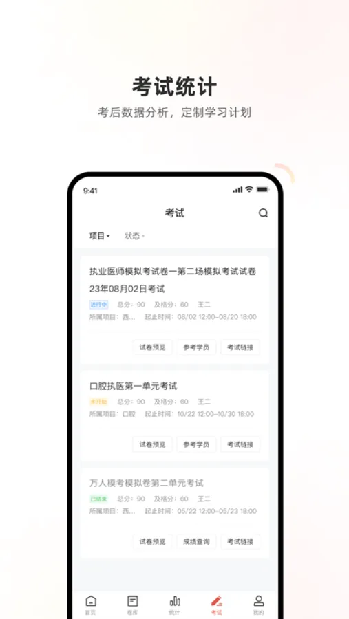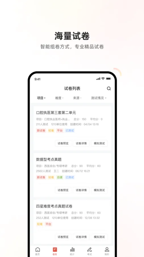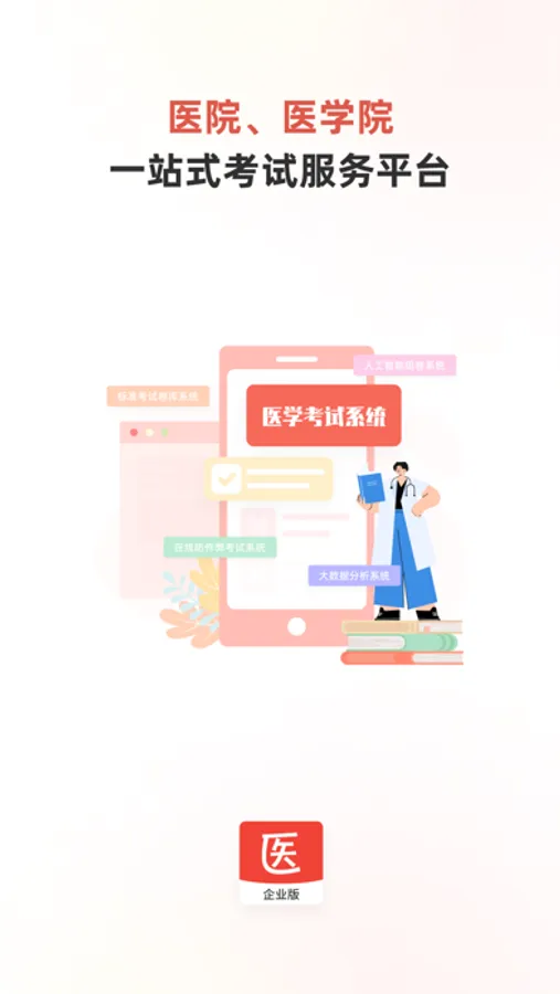 针对医学生及医生的考试和学习平台。涵盖了临床医学考研、临床执业医师、临床执业助理医师、中医考研、中医执业医师、中医执业助理医师、中西医结合考研、中西医结合执业医师、中西医结合执业助理医师、护理考研、护士执业资格、初级护师、主管护师、副主任护师、主任护师、(中)药学考研、执业(中)药师、初级(中)药士、初级(中)药师、主管(中)药师、副主任(中)药师、主任(中)药师、公卫考研、公卫执业医师、公卫执业助理医师、口腔医学考研、口腔执业医师、口腔执业助理医师、主治医师考试(中级职称考试)、副主任医师考试(副高级职称考试)、主任医师考试(高级职称考试)、住院医师规范化培训考试、医技职称考试、医学三基考试、医师定期考核、医疗卫生招聘考试、医学本科期末考试、健康管理师等数百种医学考试真题题库。解决了医院端组织考试,考试管理(创建,发布,考试,监考等),学情分析等需求点,同时辅以在线学习刷题等功能模块,功能强大、匠心汇聚,为医考学生提供高质、高效的学习、交流平台!