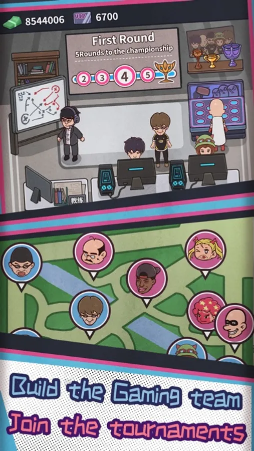 * Build up and train your e-Sports team, join video game tournaments and win prizes with your skills!