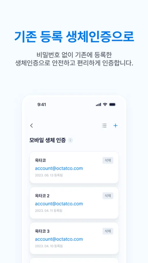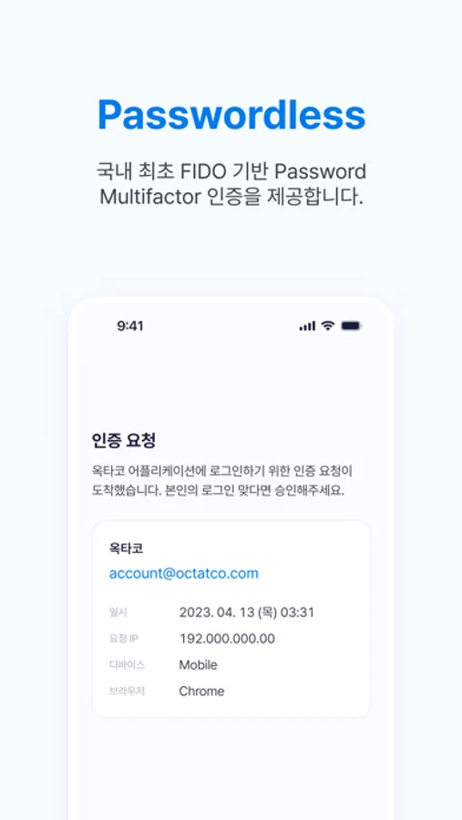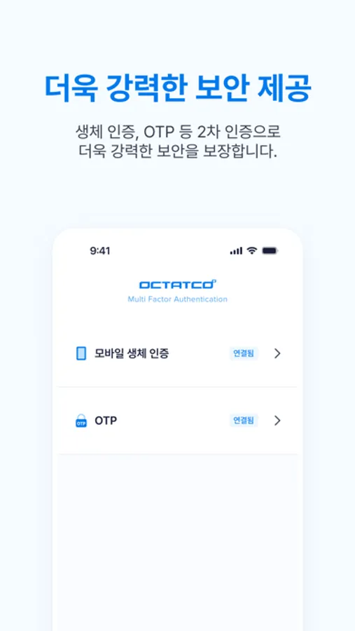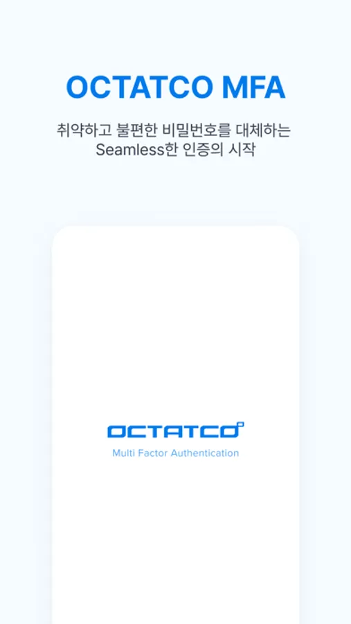 OCTATCO MFA App은 모바일에 등록한 생체인식(지문 또는 얼굴 등)을 사용자 인증 수단으로 등록 후 사용가능 합니다. OCTATCO MFA App은 취약한 패스워드를 대체하는 차세대 생체인식 기술인 FIDO기술을 기반으로하는 Passwordless Multifactor Authentication App으로 사용자를 가장 안전하고 편리하게 인증합니다. 개인정보는 사용자 모바일의 가장 안전한 영역에 저장되고 인증 서버에는 개인 정보를 저장하지 않아 피싱, 스미싱 등 해킹을 방지하는 강력하고 안전한 인증을 제공합니다. OCTATCO MFA는 6자리의 TOTP 기능을 제공하여 2차 인증 수단으로도 사용할 수도 있습니다.