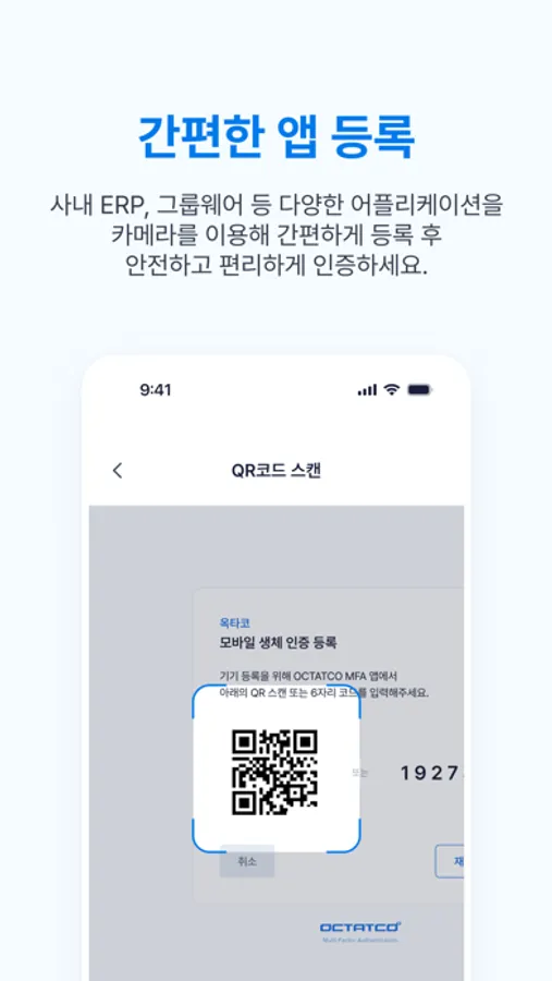 OCTATCO MFA App은 사용자의 스마트폰 카메라를 사용하여 PC 화면에 표시된 QR 코드만 스캔하여 간단히 설치할 수 있습니다.