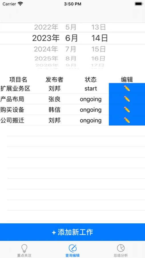 1.记录每日工作事项:在“查询编辑”界面,可时时新增、查询、编辑、删除有关的工作事项,其中工作事项可记录日期、工作者、工作内容等信息;
