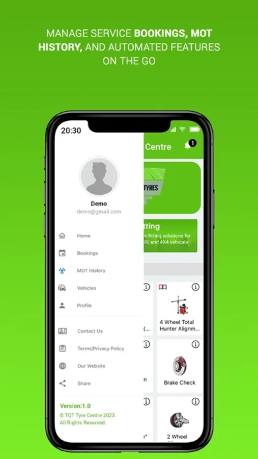 Track your MOT certificate and deadlines coming your way in one click. Get pop-up notifications for your MOT appointments and up-gradation of the vehicle. Explore through the app and find the ideal tyres from several tyre brands available for vehicles of all types in different sizes. Simply add the product or the service you wish to get in the service cart and get an overview of the prices then and there. You can also review your cart, service or product history and track other services through this app. Download the app now to avail exciting offers and great deals waiting for you in the TQT Tyre Centre app.