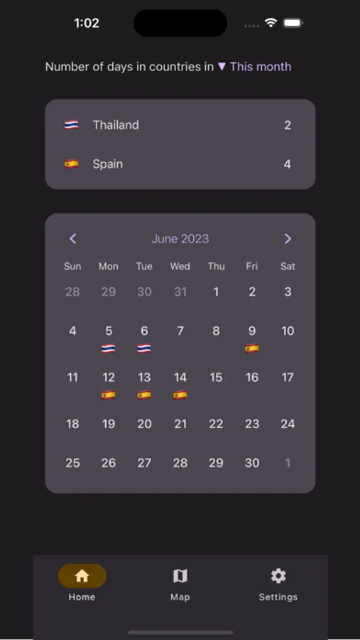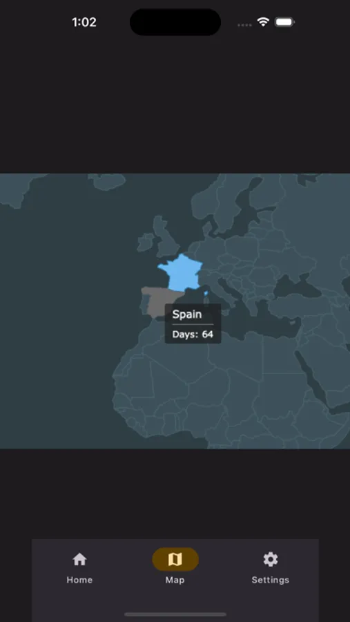 With Visited Countries Tracker, you can effortlessly keep a record of your daily whereabouts and discover how many days you've spent in each country. It's simple to use: just open the app, tap the tracking button, and let us do the rest. We'll automatically pinpoint your location and update your travel log accordingly.