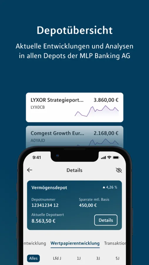 Depotentwicklung: Verfolgen Sie die Entwicklung Ihres Anlagevermögens in von Ihnen gewählten Zeiträumen. Erhalten Sie Einblicke in die Performance Ihrer Investitionen für fundierte finanzielle Entscheidungen.