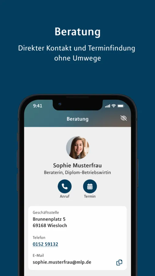 Schneller Weg zur Beratung: Die Financial Home App ermöglicht Ihnen direkten Kontakt zu Ihrer MLP Beraterin oder Ihrem MLP Berater. Egal ob Sie Fragen haben, Beratung wünschen oder Unterstützung benötigen – MLP ist nur einen Fingertipp entfernt.